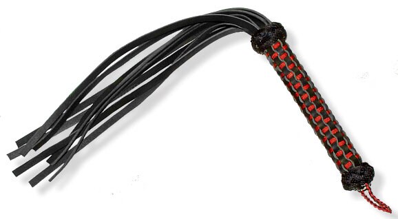 This is a time-tested design for a simple, attractive, economical punishment Cat that gets the job done. It is light, fast and well balanced. Tresses are extremely flexible, thicker than usual, of Black Bullhide, which flies well and hits with authority. The tresses are woven to the handle with a colored band of nylon in your choice of color.