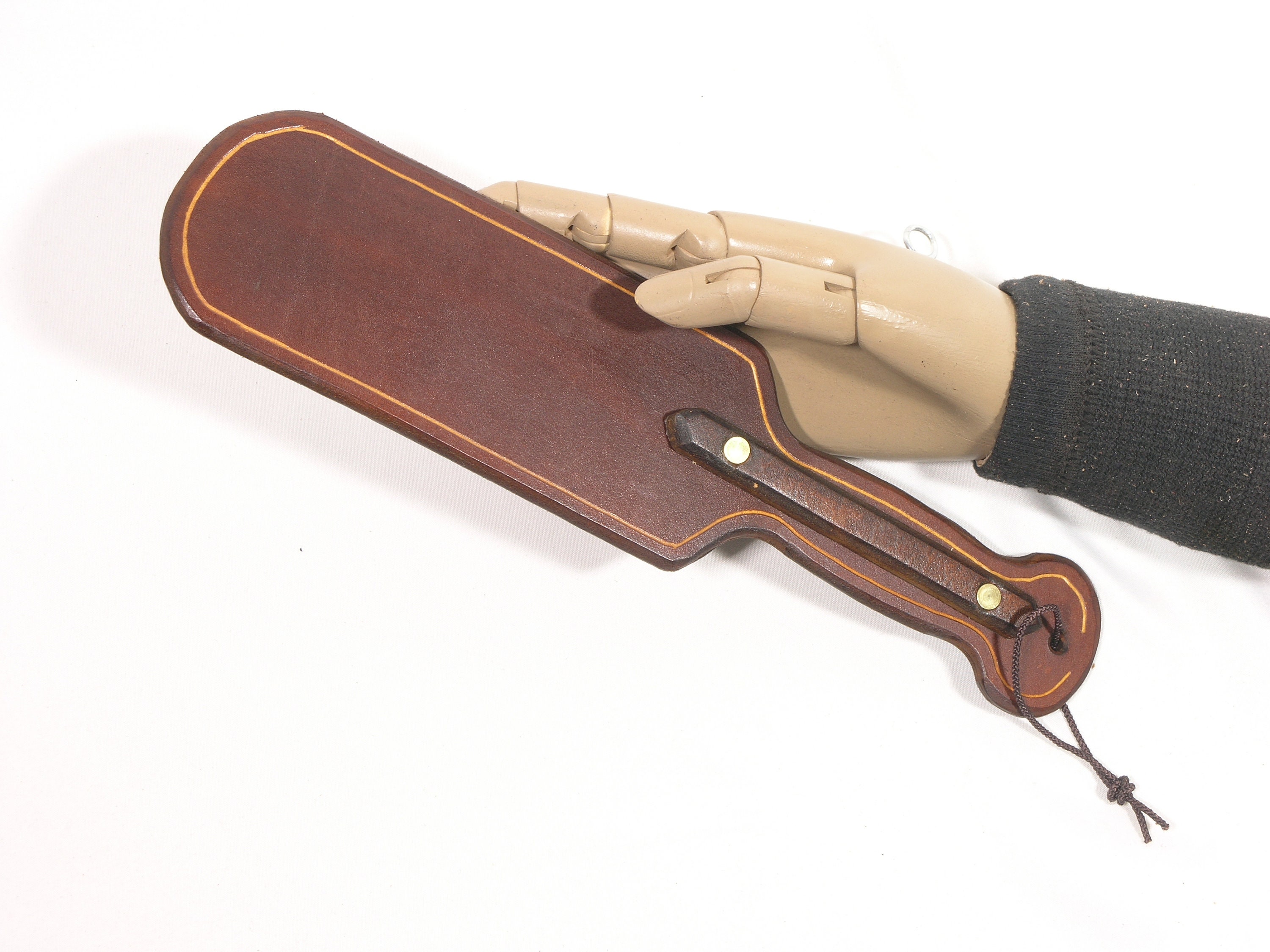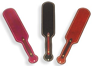 Made of a single layer of Brown, Black or Burgundy sole-bend leather, with a dark brown handle stiffener, it is gracefully curved, beveled and grooved with a width of 3" and a length of 12" or 14" . This is a light, not-too-severe spanky paddle with a nice hot sting to it. Slight cosmetic flaws will not harm performance or durability. In 14" length, we have BURGUNDY only. In 12" length we have BLACK and BROWN only, USE MESSAGE feature to select which one you want