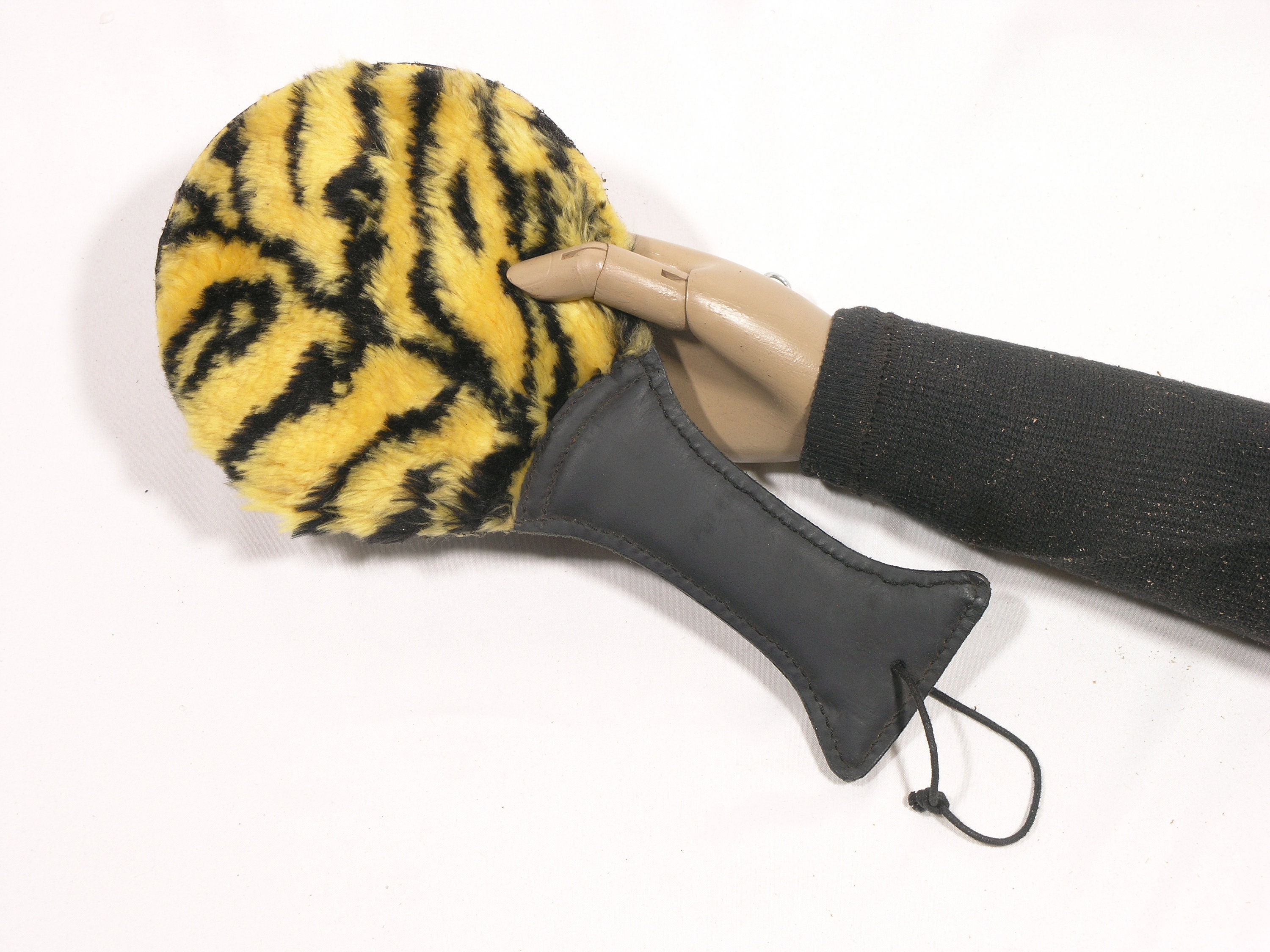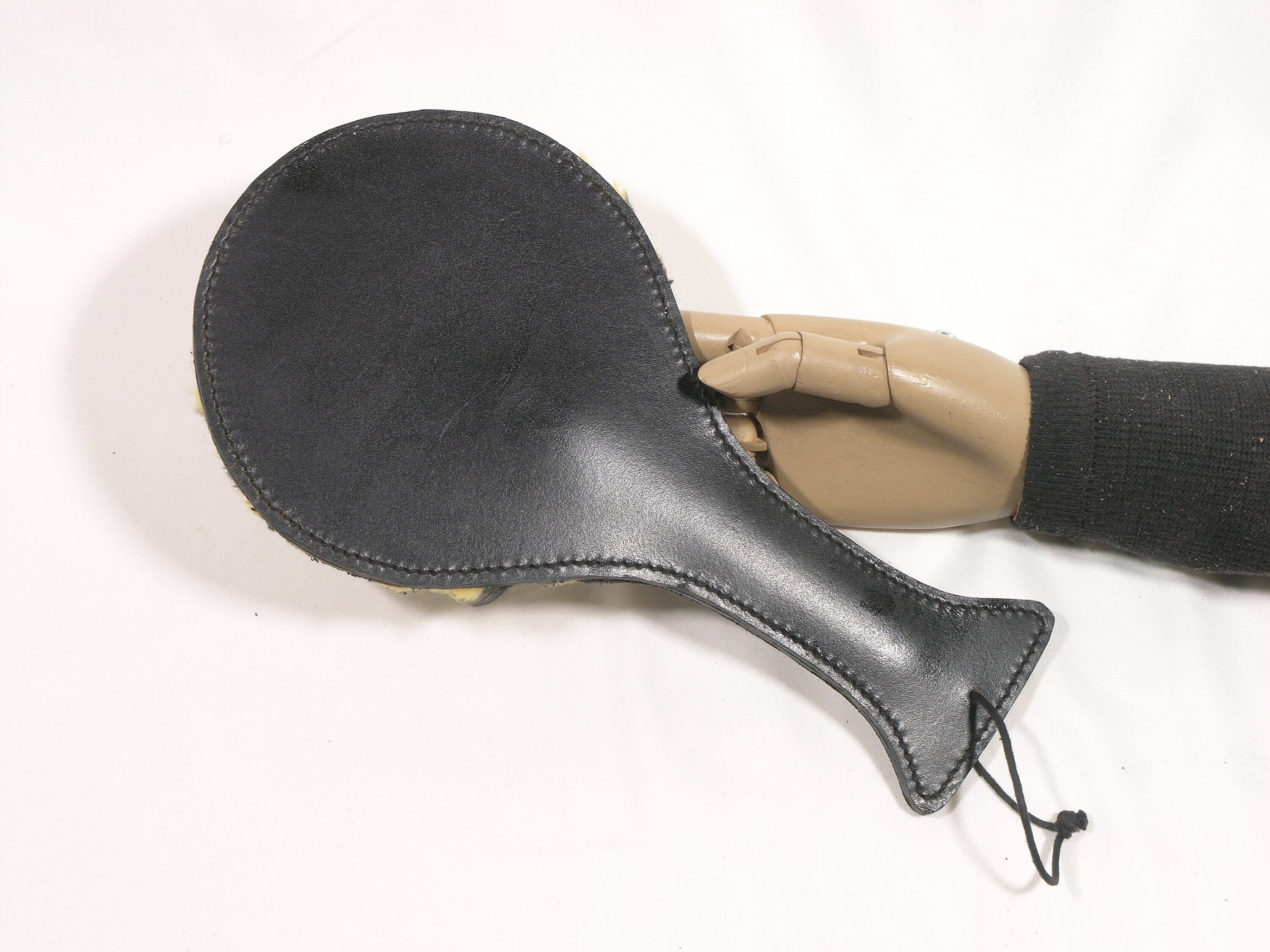 Great for novices ... Stitched 6" x 12" leather paddle with spring steel stiffener inside. One side smooth and stingy .. the other side is padded for patting and caressing ...