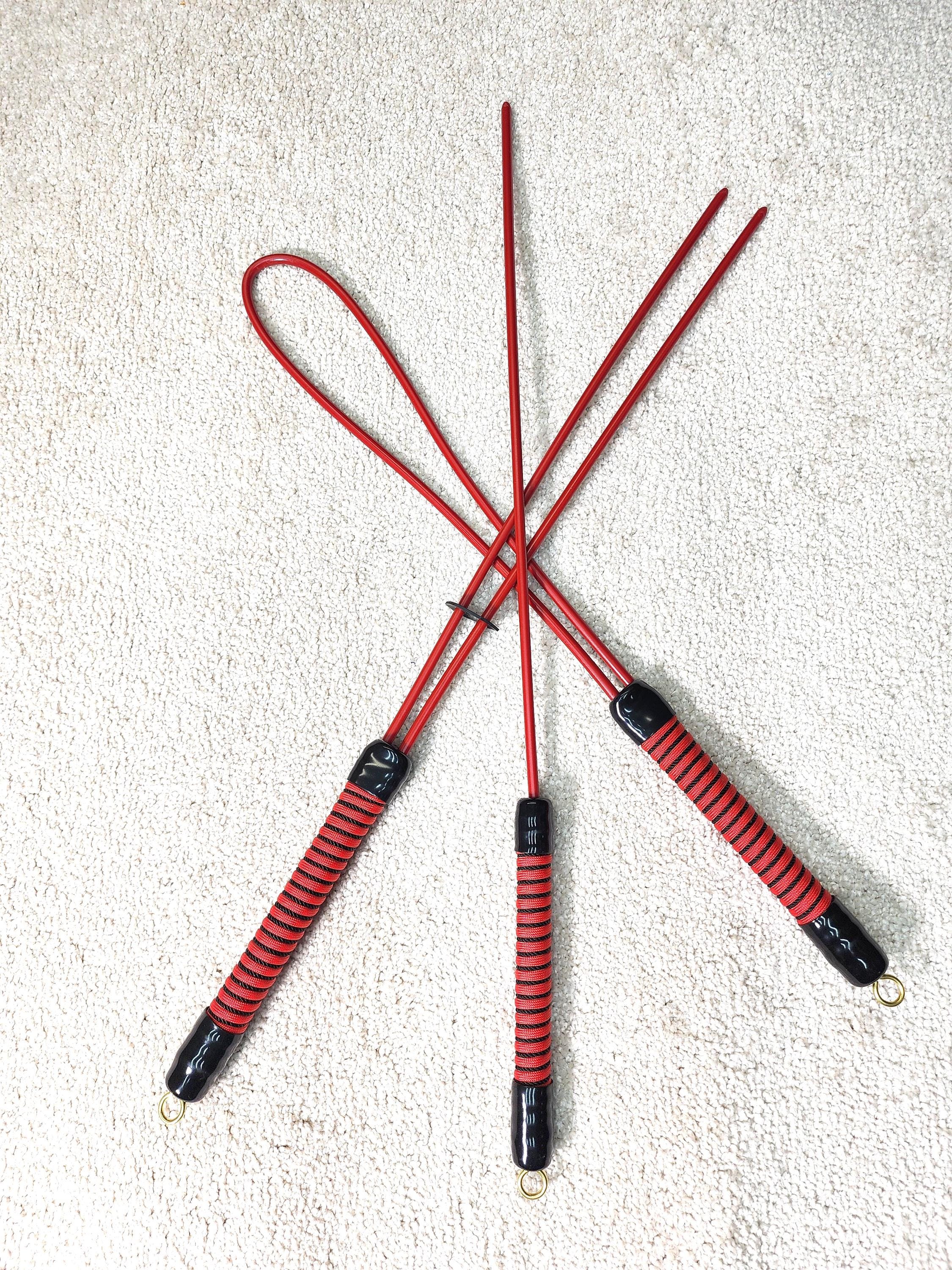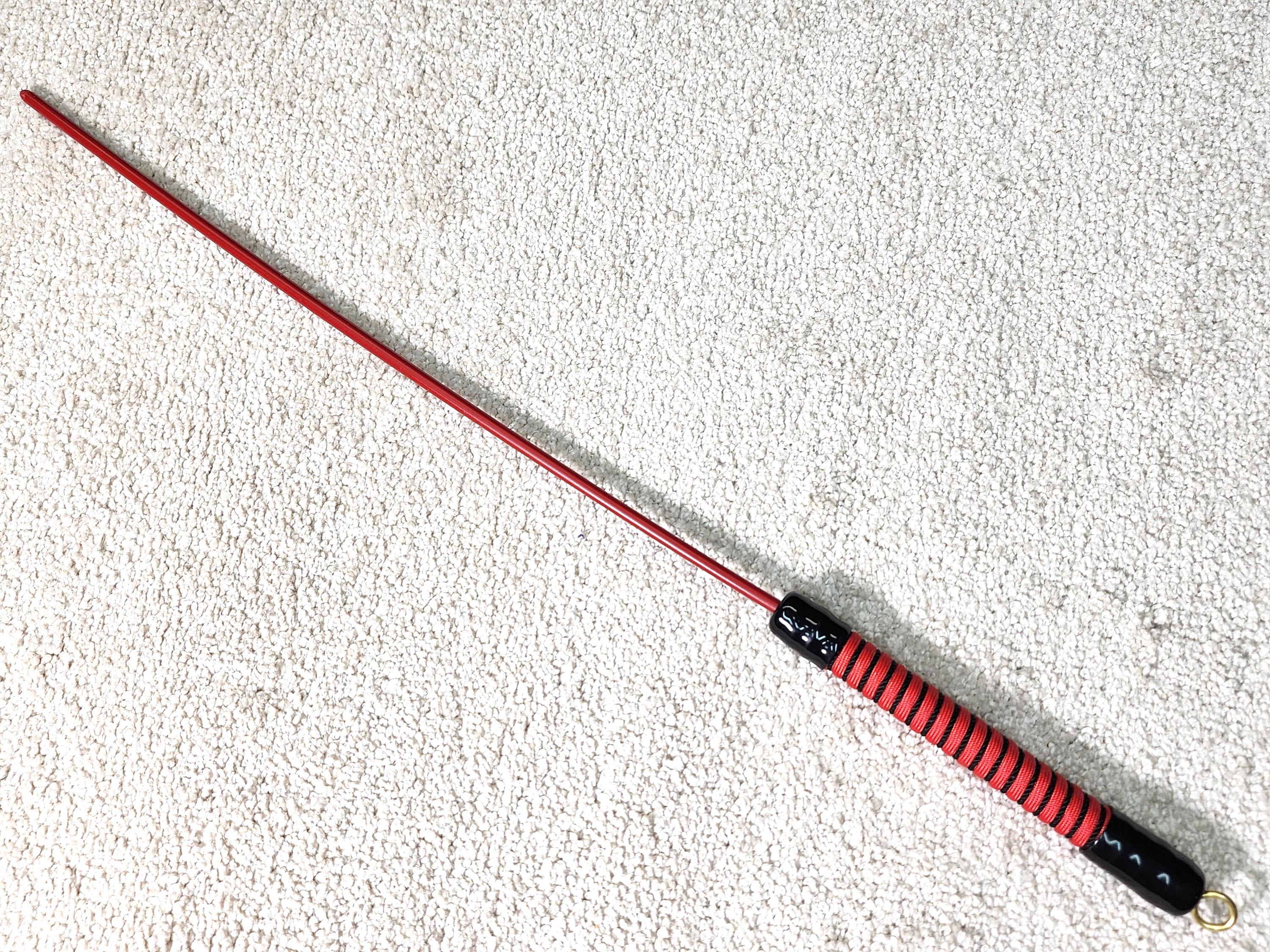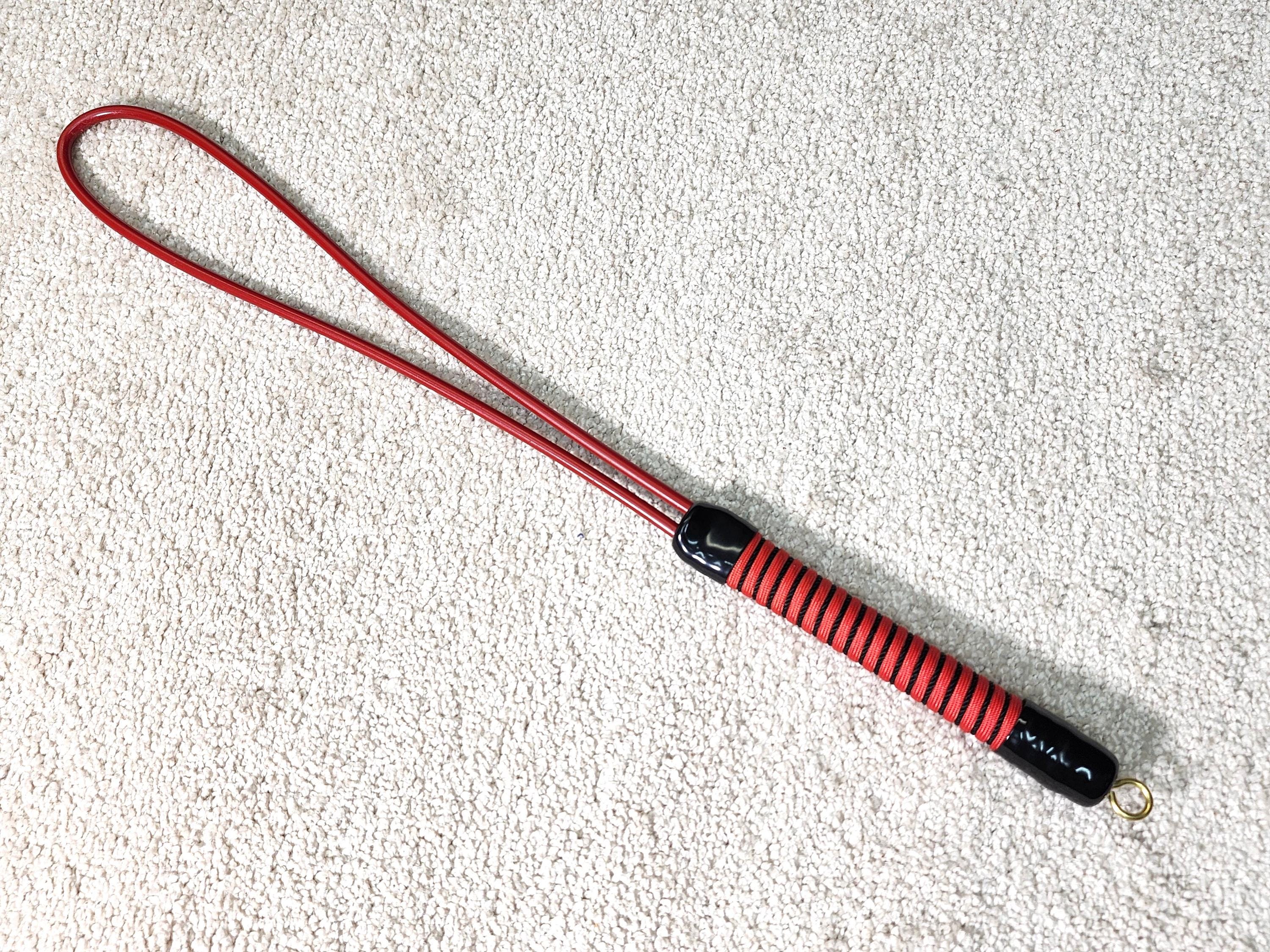 This flexible, soft-density polyethylene shaft is not to be underestimated! It looks non- threatening but is like a peach switch that never dries out! Really nasty -- especially when used on the bare calves. Plain-wrapped handle in choice of colors with black end caps.