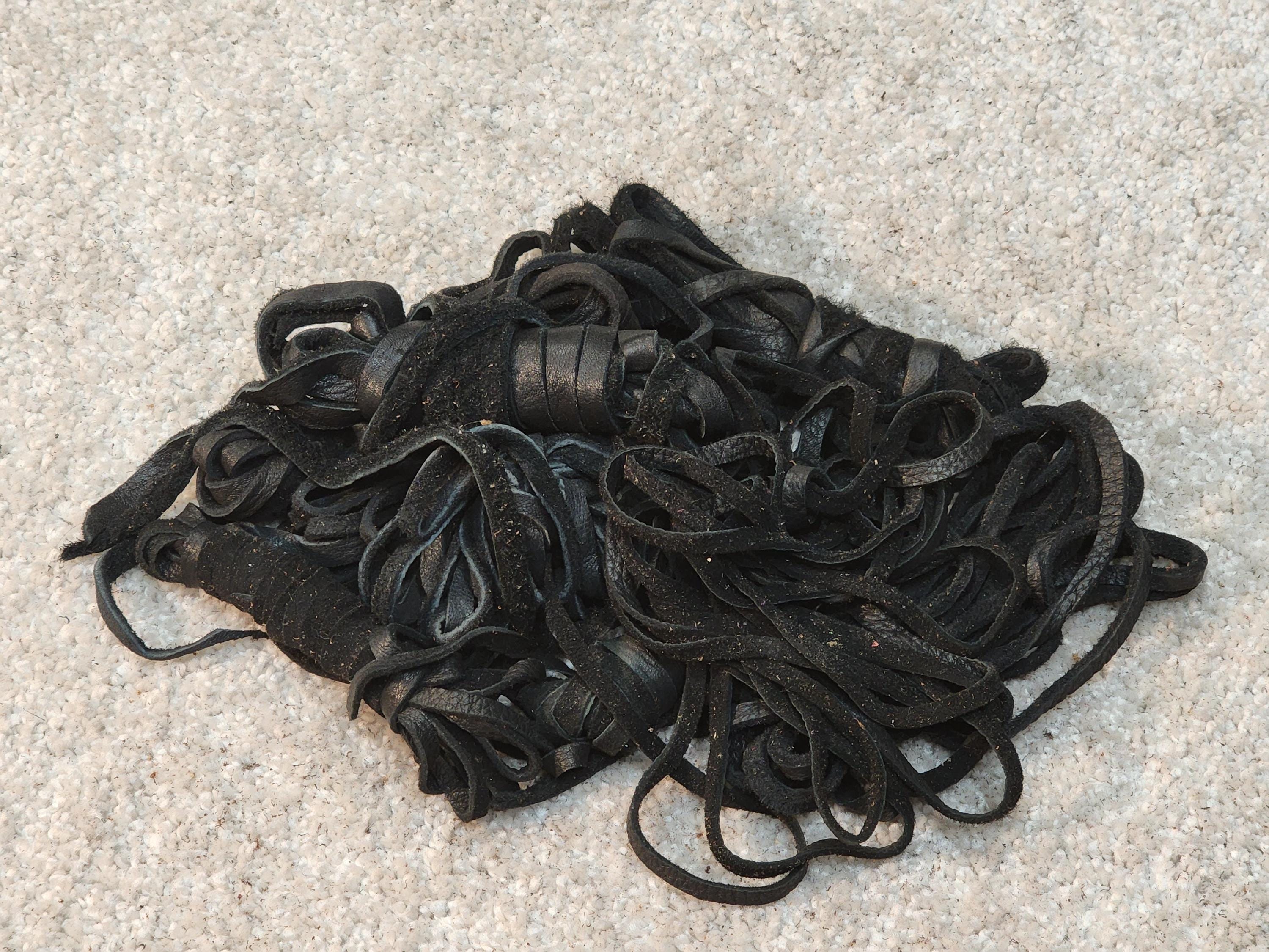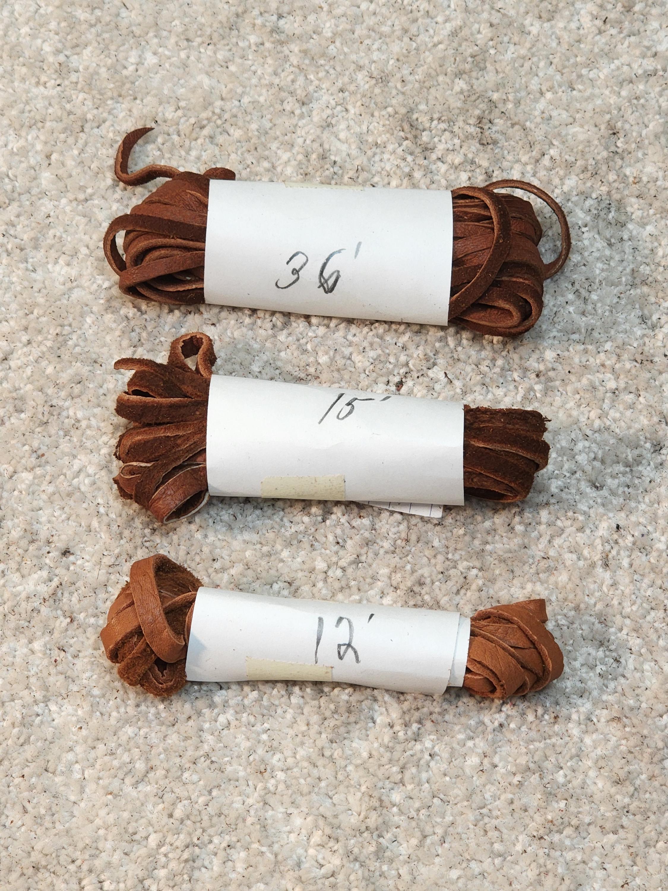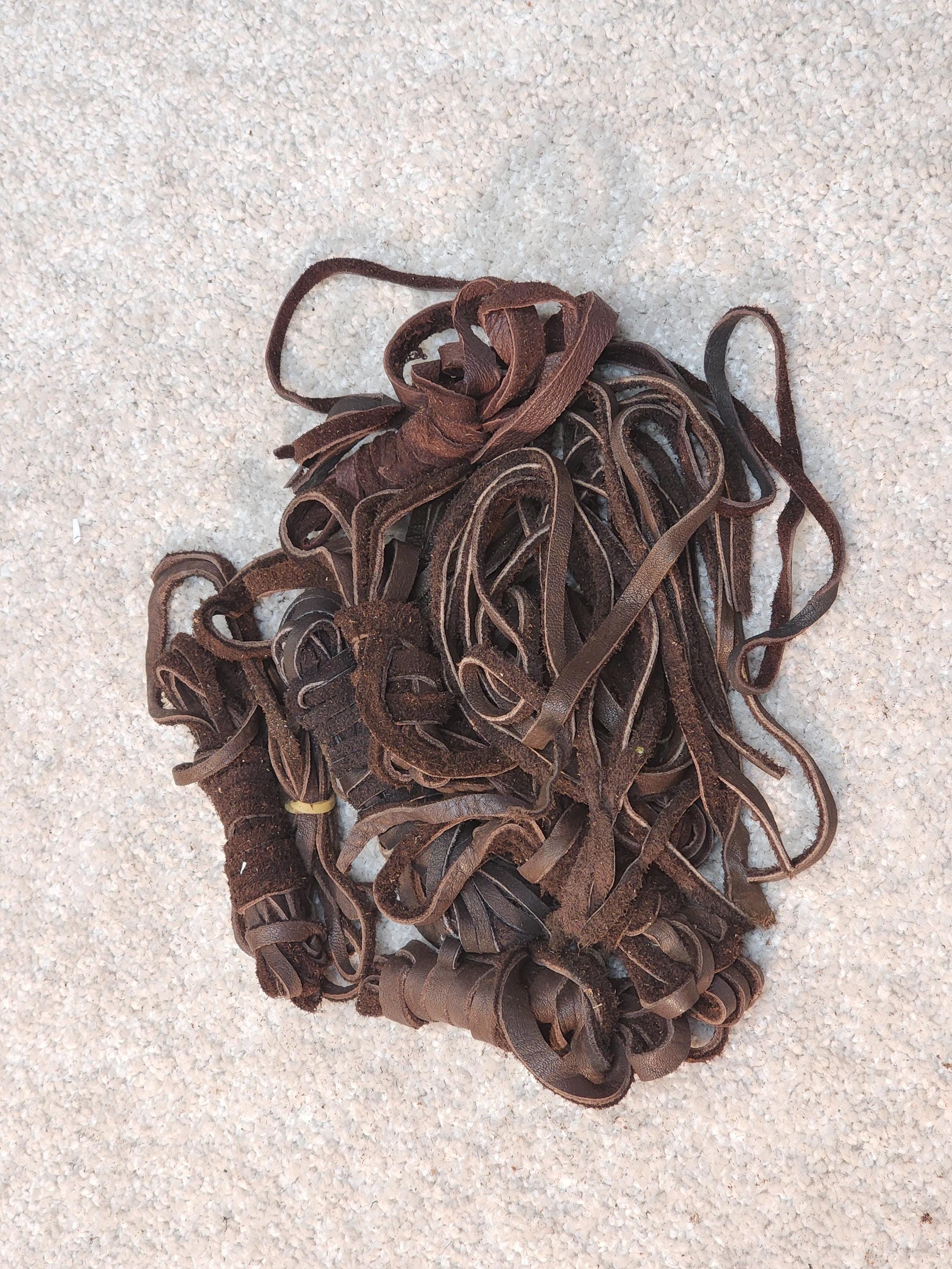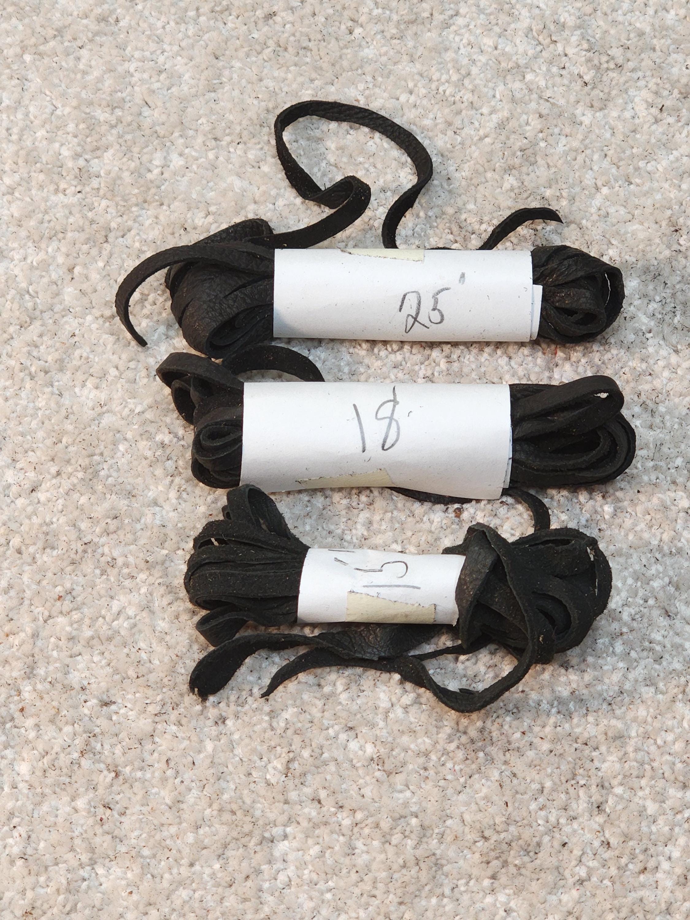Hand cut from scrap, this "Moose" lacing is a very strong, slightly elastic leather lace -- about 50% THICKER than "Deer". Width: 1/4" { 5mm] @ $1.20/ft or 1/8" [3mm] @ $0.88 /ft. Price is for 25 ft skeins. Pieces in skeins are minimum 6ft long [ 180cm ] each.MESSAGE Adam and Gillian's for QUOTES ON DIFFERENT LEATHERS, lengths, and colors. For many years "real Moose" has not been available because of the Brain Worm epidemic in the wild populations -- Moosehide is now, for the most, taken from farmed Elk and sometimes Raindeer: essentially the same animal, but with different antlers.