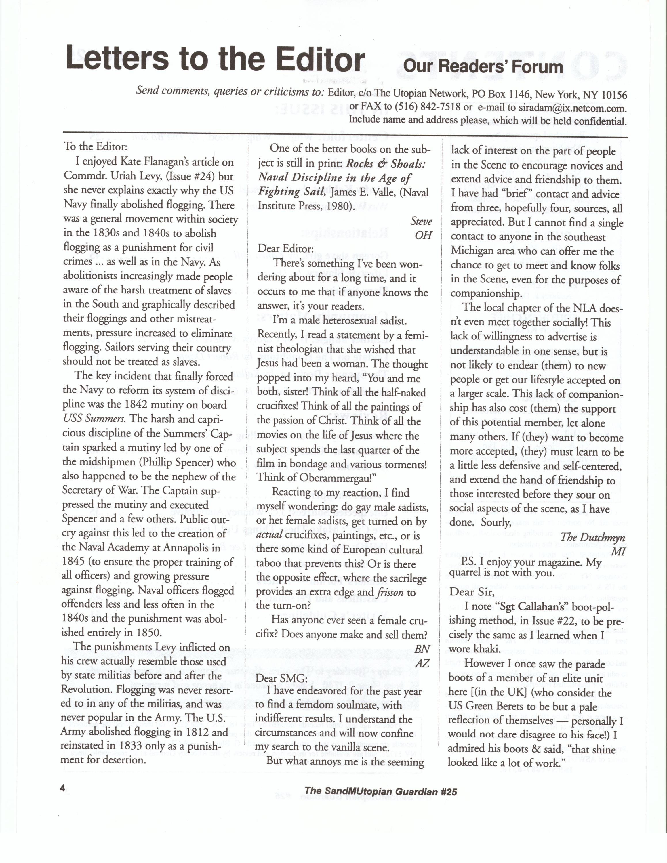 HISTORICAL NOTES: Sandmutopia Guardian was the heterosexual, redheaded bastard stepchild of The Leather Journal, an explicitly Gay Male publication. There was no “Internet,” there were few in-person BDSM venues, “the munch” had not yet been invented; and reliable information and quality merchandise were difficult to find.