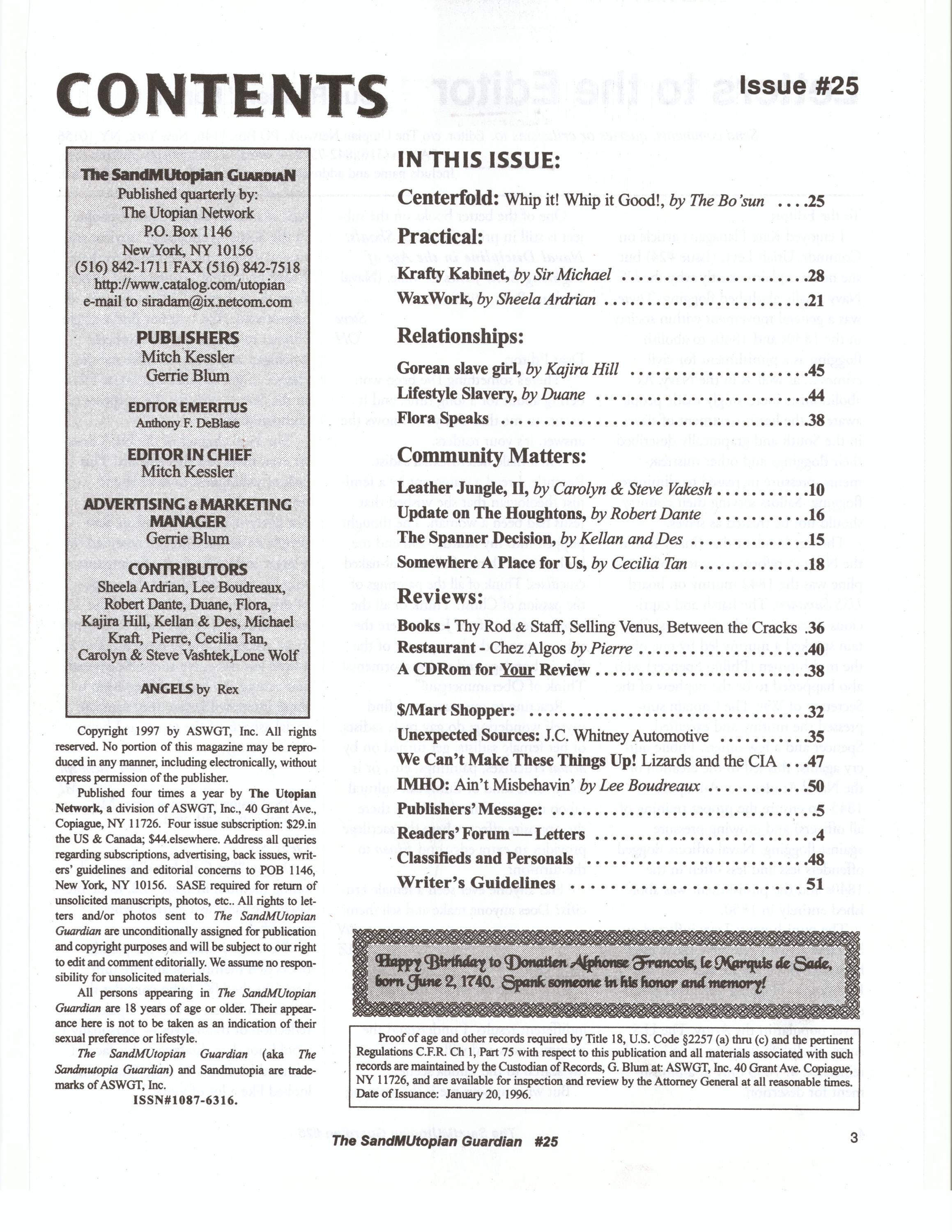 Published irregularly, The Guardian was distributed in a handful of newsstands and Leather stores. However Adam and Gillian's Sensual Whips and Toys became viable ENTIRELY because of advertising in The Guardian managed and edited by the late Tony DeBlaise an icon of the SF Leather scene. When Tony announced that he would retire The Guardian for dearth of readership Adam and Gillian, who said “we know the Guardian has arrived, because our orders started coming in” bought the publication, renaming it SandMUtopian Guardian, to underscore the “Pansexual” nature of the new management, conceptualizing the magazine as “a cross between The Manchester Guardian, a political newspaper, and Popular Mechanics, a magazine for do-it-yourselfers.”