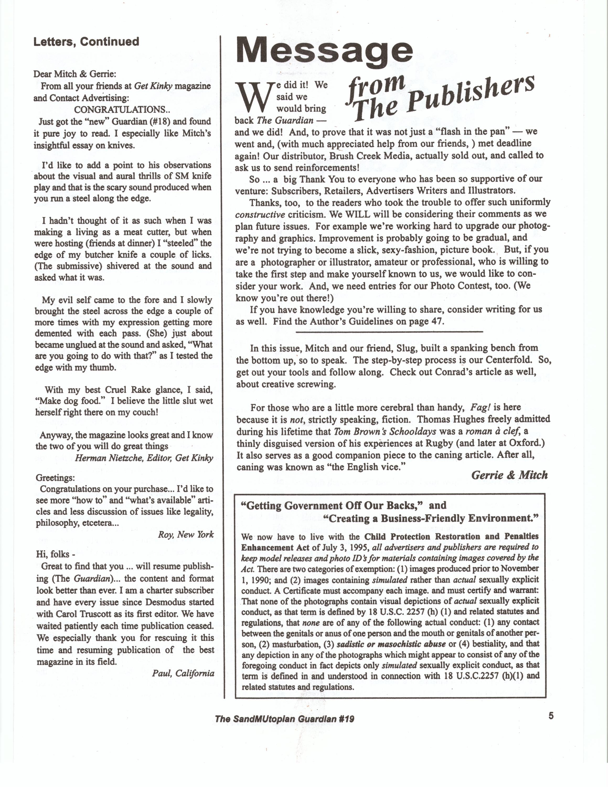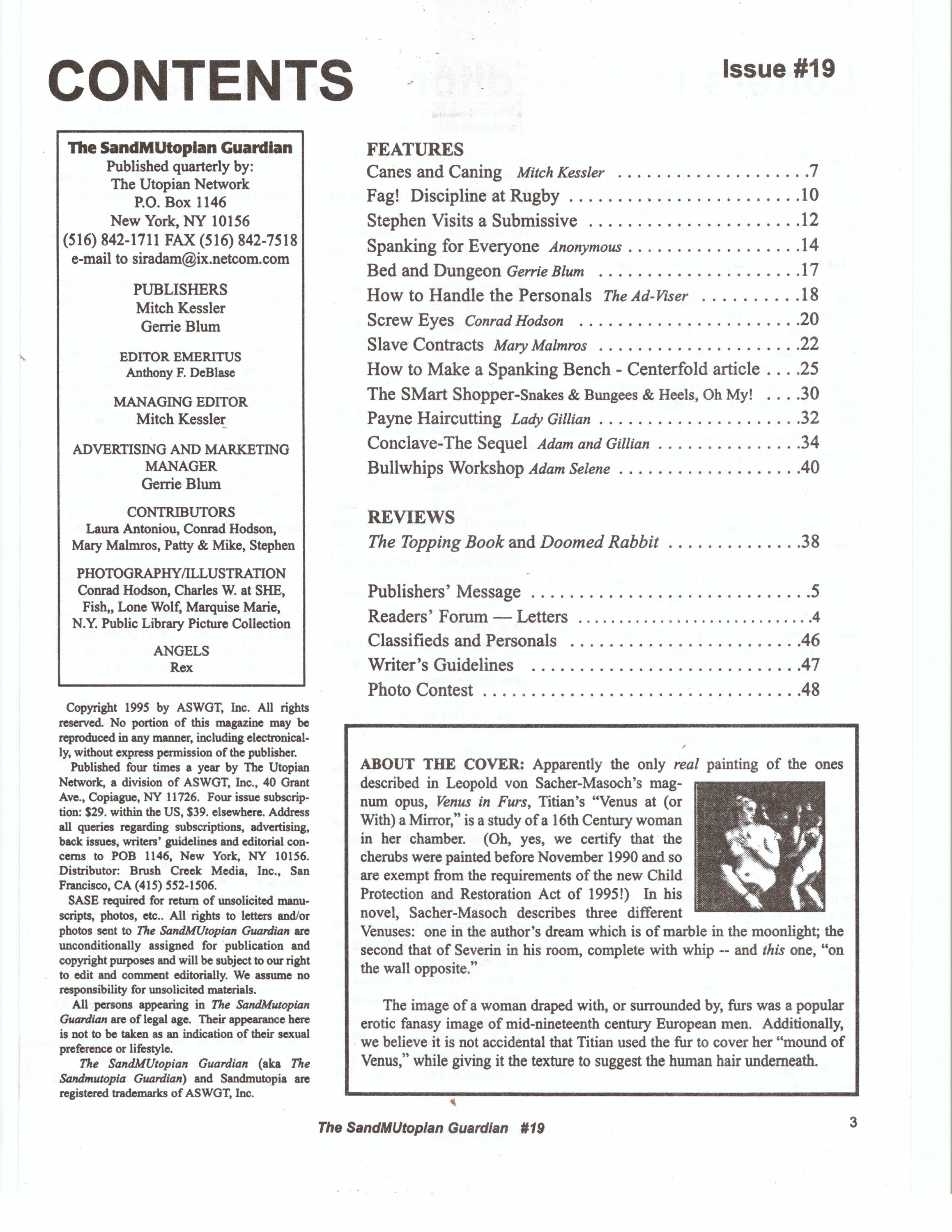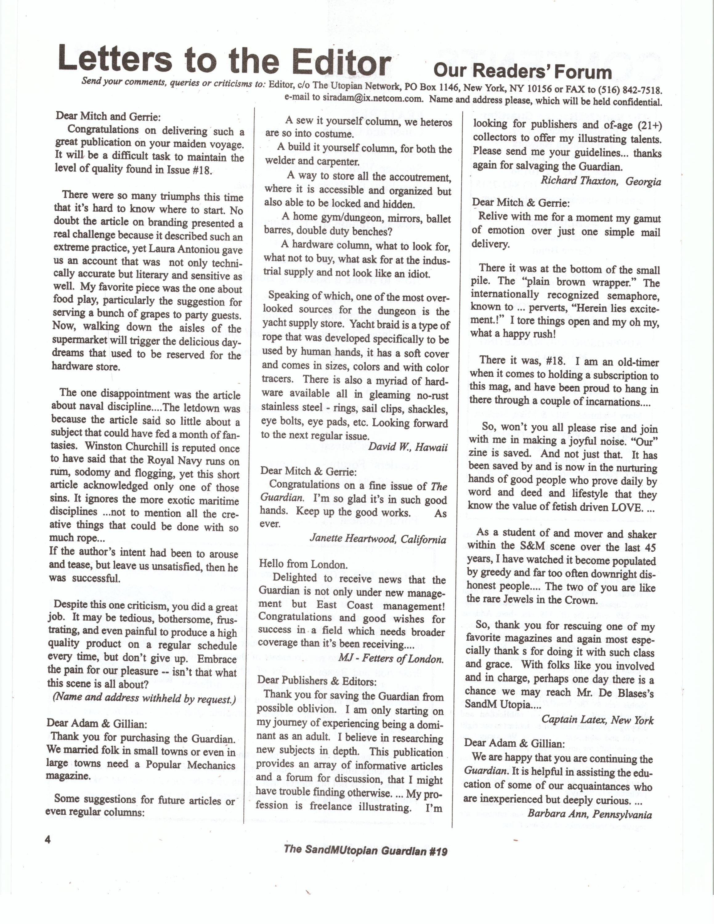 Published irregularly, The Guardian was distributed in a handful of newsstands and Leather stores. However Adam and Gillian's Sensual Whips and Toys became viable ENTIRELY because of advertising in The Guardian managed and edited by the late Tony DeBlaise an icon of the SF Leather scene. When Tony announced that he would retire The Guardian for dearth of readership Adam and Gillian, who said “we know the Guardian has arrived, because our orders started coming in” bought the publication, renaming it SandMUtopian Guardian, to underscore the “Pansexual” nature of the new management, conceptualizing the magazine as “a cross between The Manchester Guardian, a political newspaper, and Popular Mechanics, a magazine for do-it-yourselfers.”