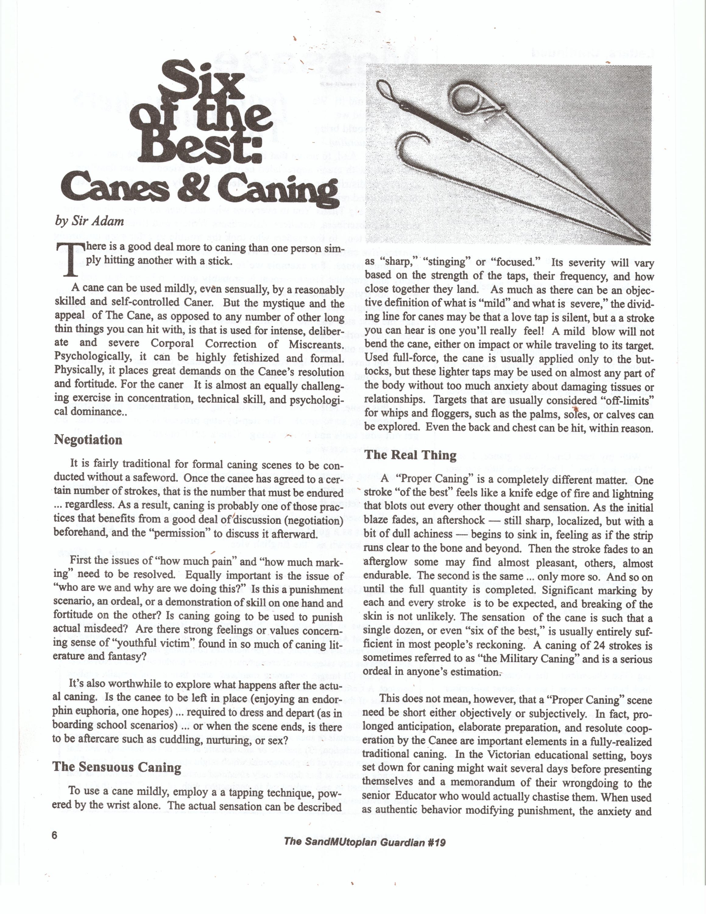 Everything you want to know about the customs, rituals and pleasures of caning. Also, choosing the right cane and the right material. [Read article.]