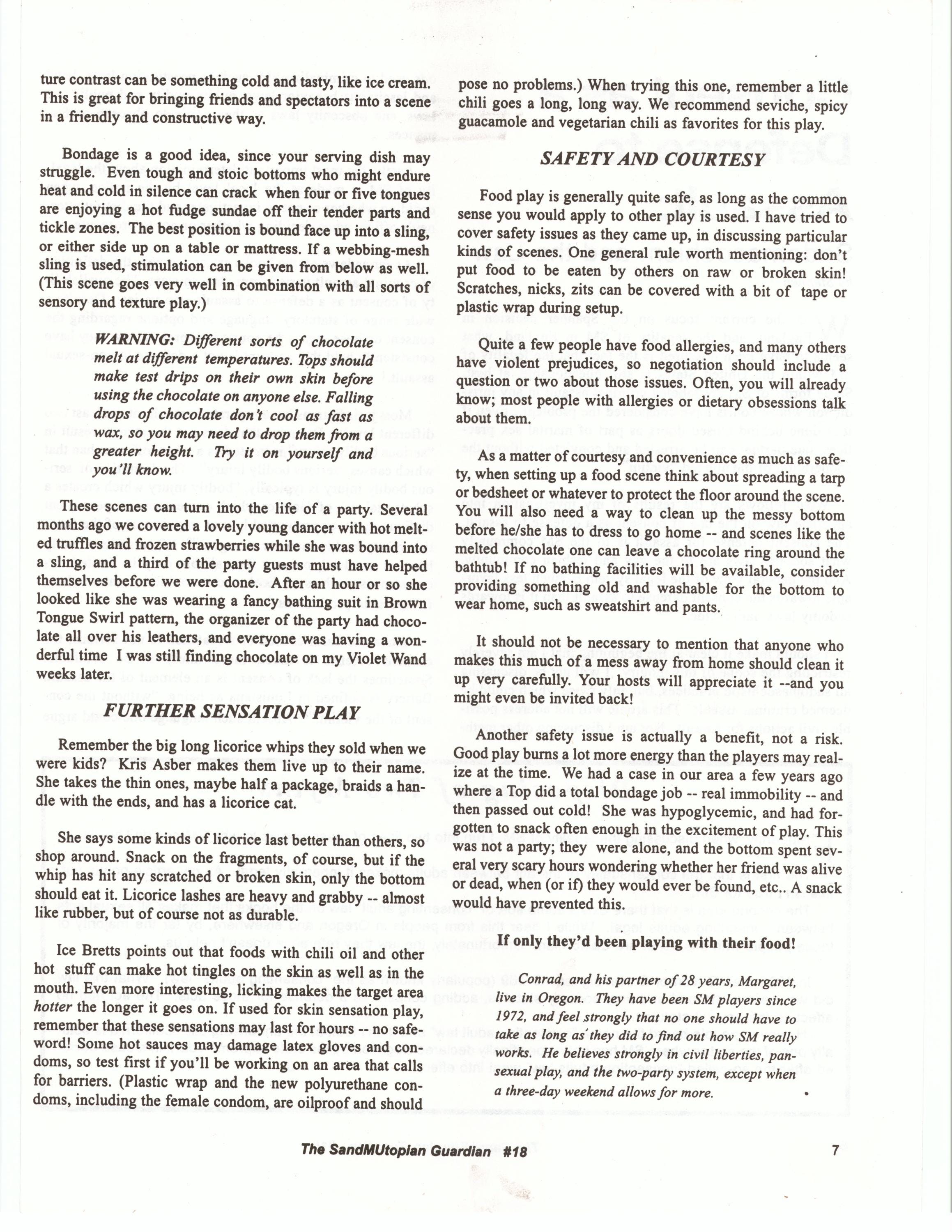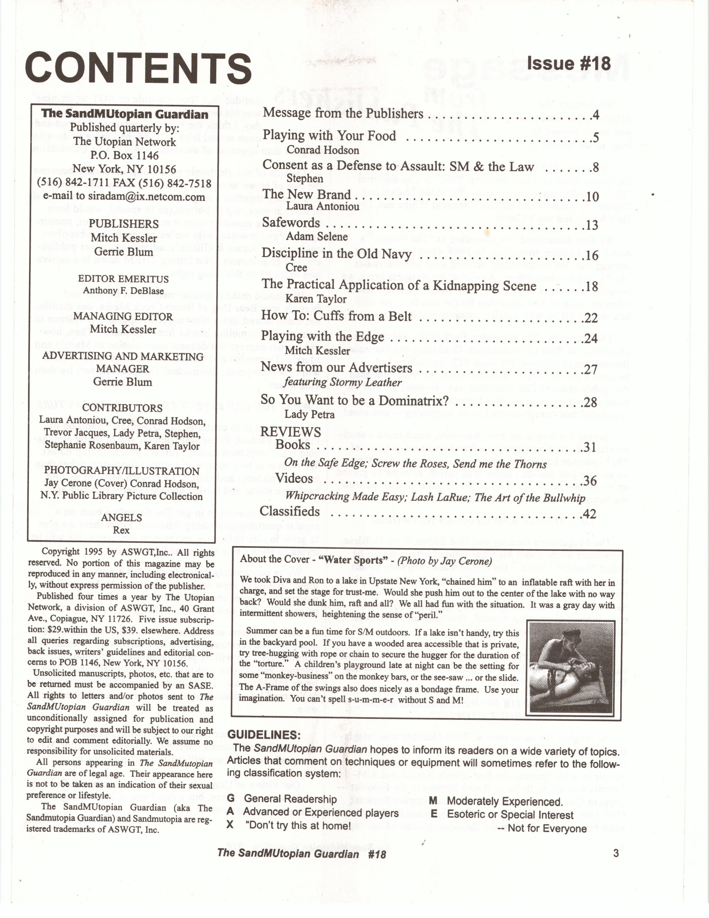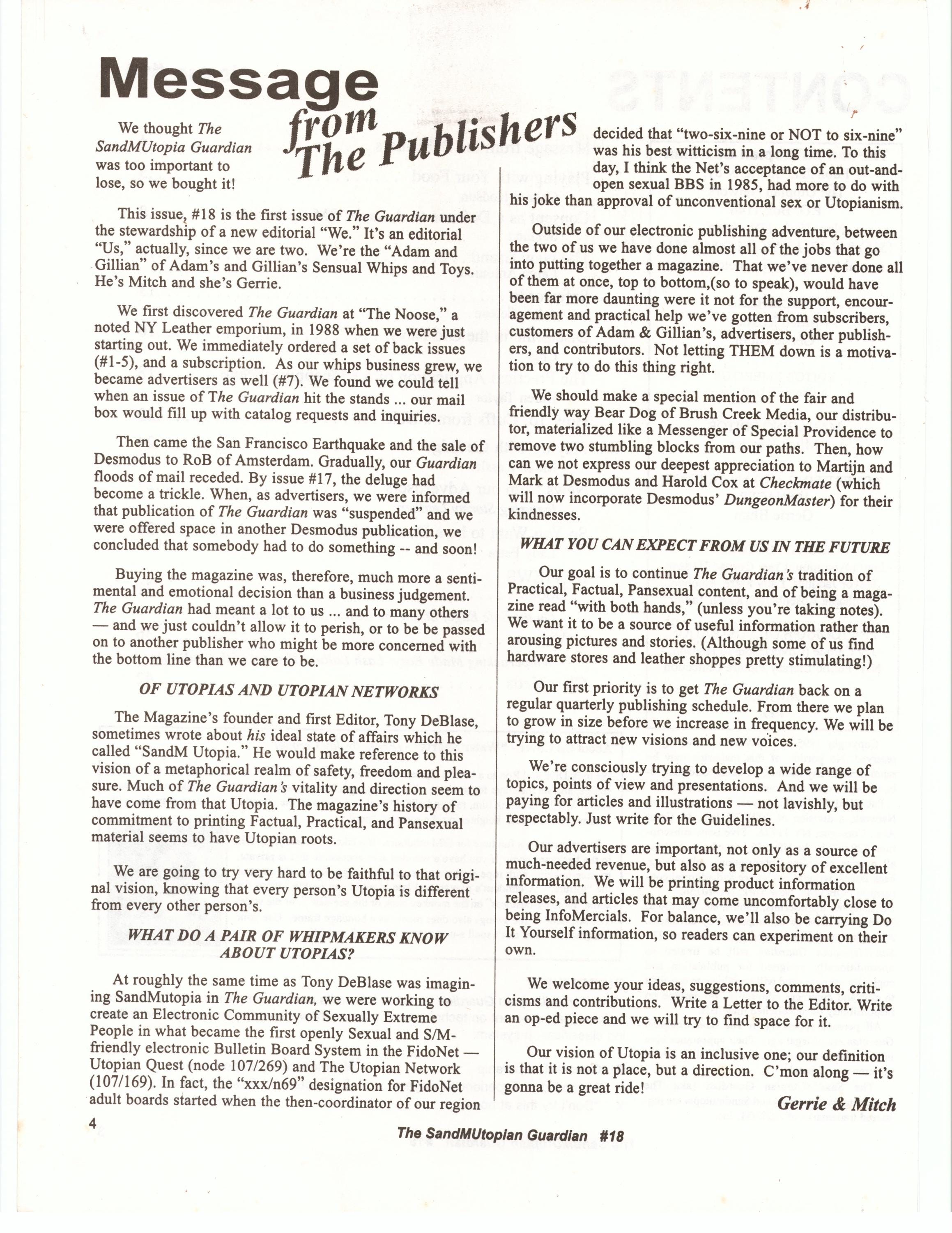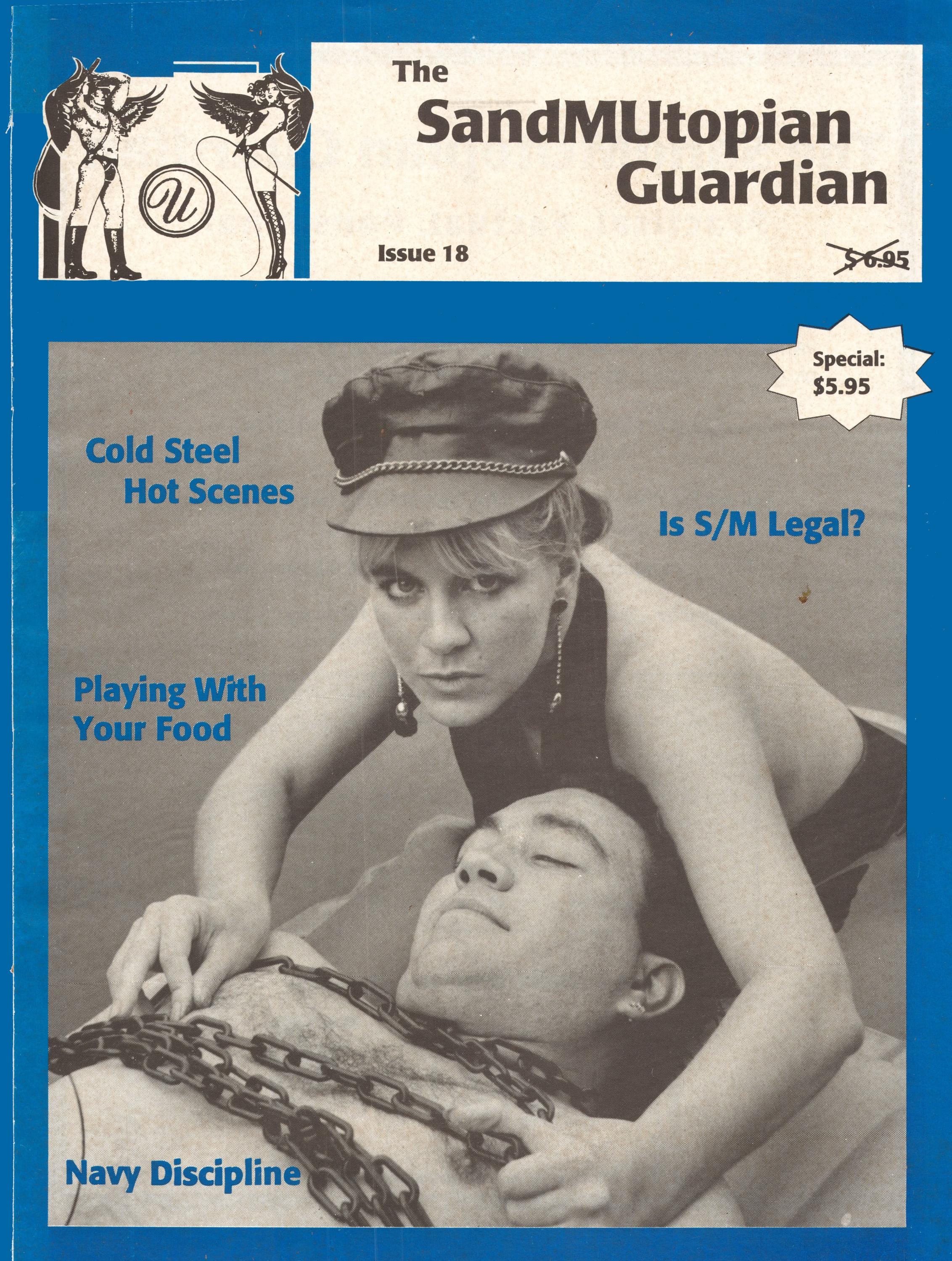 Published irregularly, The Guardian was distributed in a handful of newsstands and Leather stores. However Adam and Gillian's Sensual Whips and Toys became viable ENTIRELY because of advertising in The Guardian managed and edited by the late Tony DeBlaise an icon of the SF Leather scene. When Tony announced that he would retire The Guardian for dearth of readership Adam and Gillian, who said “we know the Guardian has arrived, because our orders started coming in” bought the publication, renaming it SandMUtopian Guardian, to underscore the “Pansexual” nature of the new management, conceptualizing the magazine as “a cross between The Manchester Guardian, a political newspaper, and Popular Mechanics, a magazine for do-it-yourselfers.”